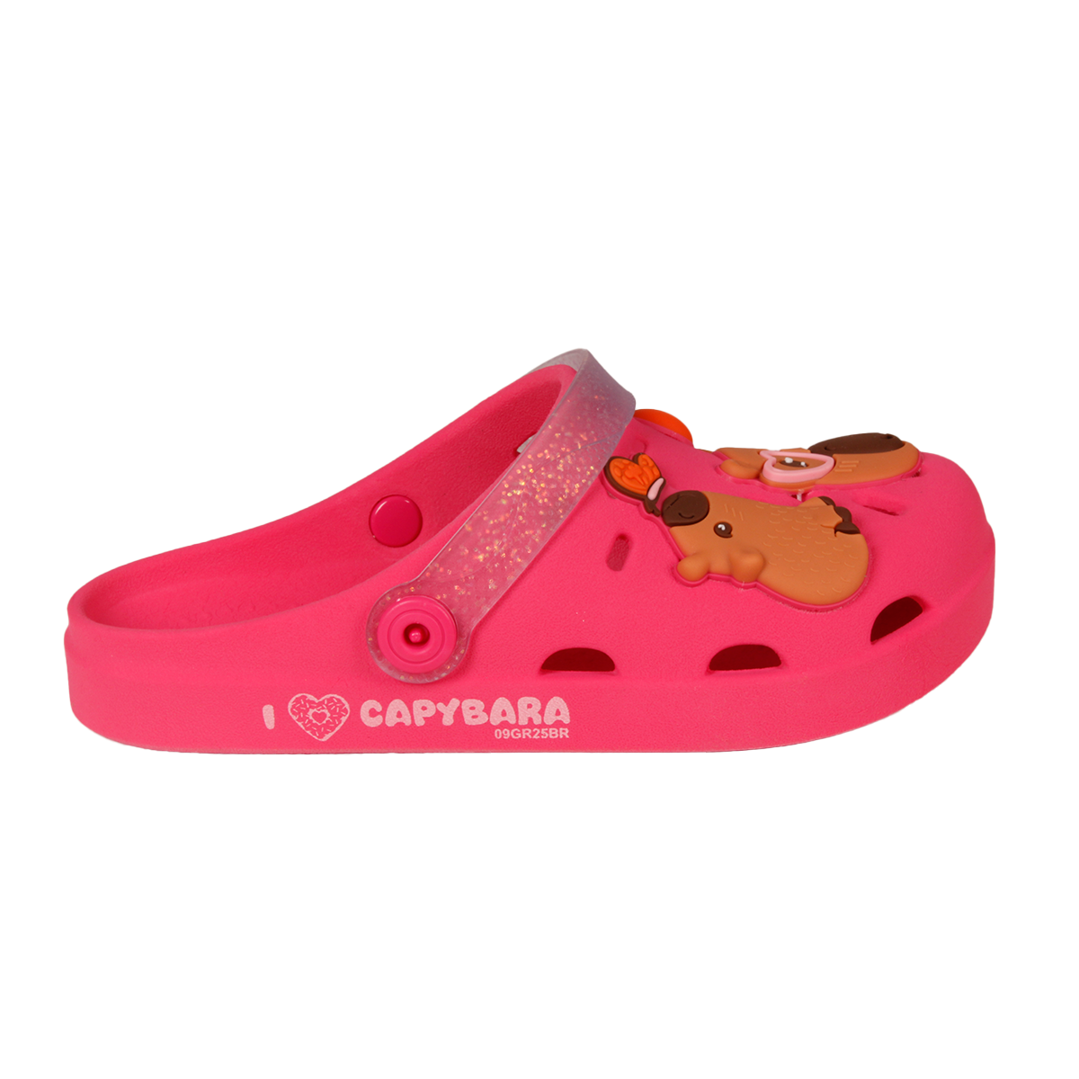 As capivaras estão conquistando corações e ganhando espaço no mundo da moda e do entretenimento infantil, de matérias escolares, pelúcias, roupas e acessórios, as capivaras estão por todos os lados! A Babuche Infantil Capivara Hype Grendene Kids possui um aplique super divertido, onde nossa capivara está em uma destaque em uma boia de donuts, deixando ainda mais lúdico o arquétipo, uma serigrafia em de ondas complementa a cena, para o palmilha, boias de coração preenchem a sola.